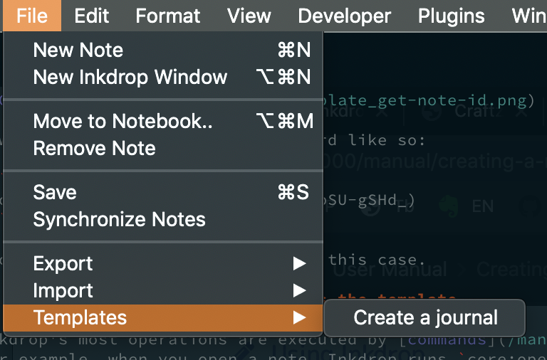 Next, we need a way to invoke the command we've made. Inkdrop allows you to add custom menus to run arbitrary commands. The below code adds a menu to File -> Templates -> Create a journal, which runs custom:new-journal command.